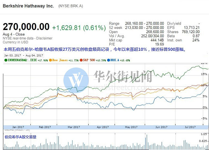 周五伯克希尔B股收涨0.52%,盘后时段财报公布后股价震荡,一度跌至178美元,跌超1%,后反弹接近平收,但跌幅又再度扩大,跌超2%。伯克希尔A股周五收涨0.61%,收报创纪录的27万美元,盘后持平。