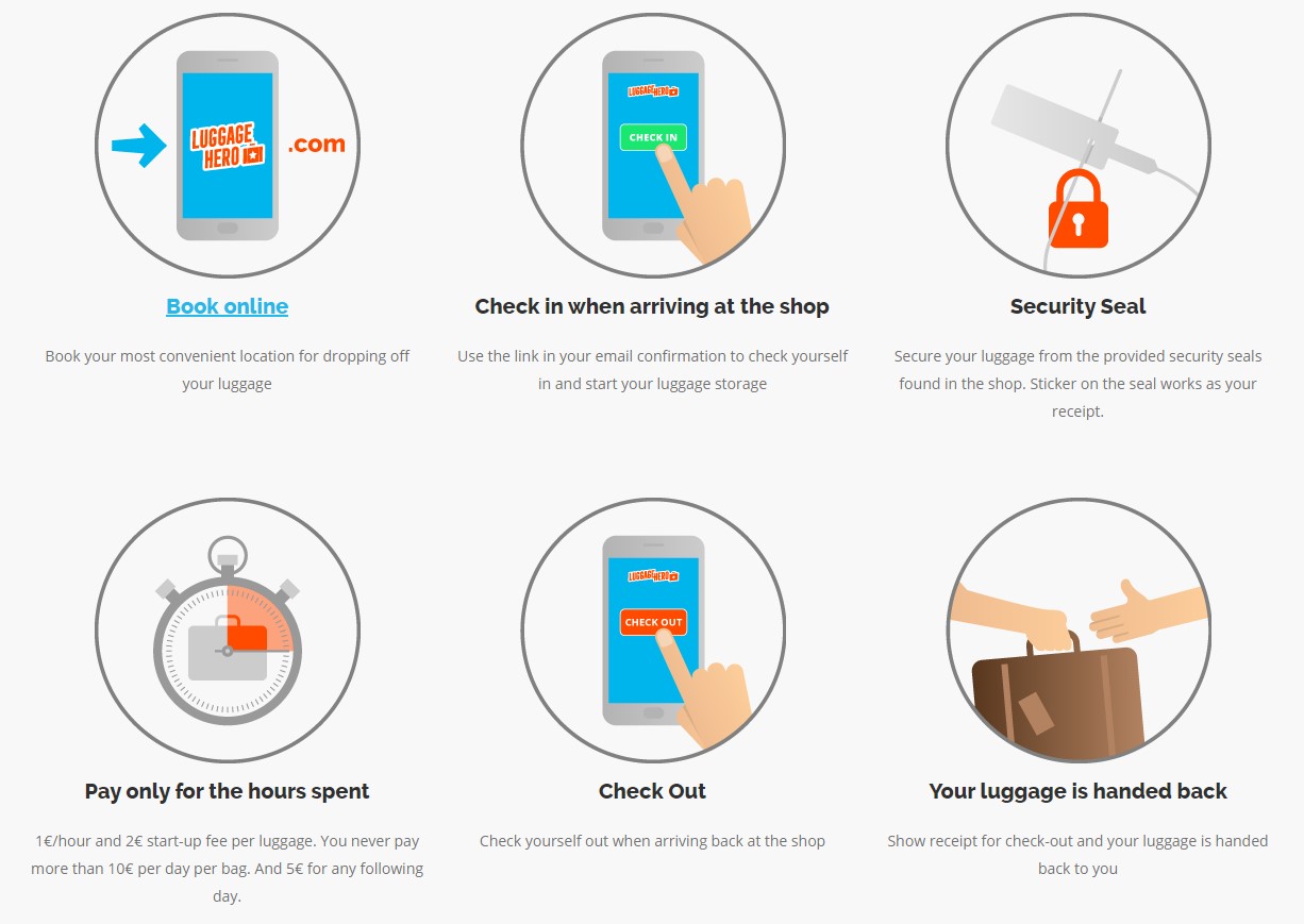这是一项名为LuggageHero(行李英雄)的在线行李寄存服务系统,它让用户通过手机APP或电脑从分布在城市不同地区的几十个行李寄存点查询并预约,抵达寄存点后将行李交由专人加锁保管以确保财物安全。该服务按时计费取件付款,每件行李起价2欧元,每小时1欧,日封顶10欧,价格也算公道。