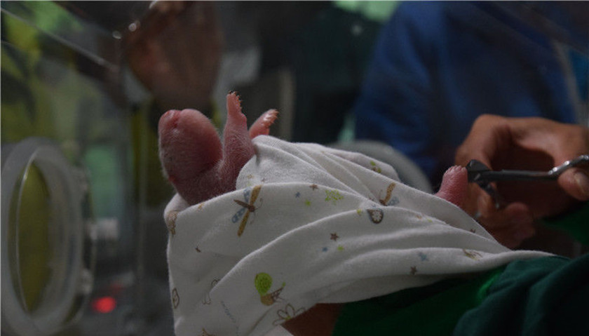 经过13小时的努力,“草草”产下一只体重216克的雄性幼仔。“通常大熊猫宝宝刚出生时体重一般在150克左右,超过200克的都为少见。”中国大熊猫保护研究中心研究人员说,这只大熊猫幼仔算是熊猫界名副其实“重量级”选手了。