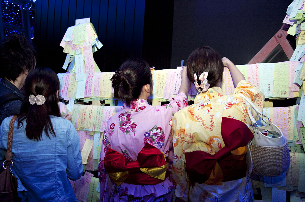 在日本传说,织女不但要赐给孩子们巧手,还要负责满足各种愿望。每年这个时候,大人和孩子都会聚在一起,在五颜六色的长条诗笺上写下愿望,连同用纸做的装饰品一起挂在自家院内的小竹子上,以此请求织女星保佑自家女孩的手艺能有所进步。图片来源:东方ic