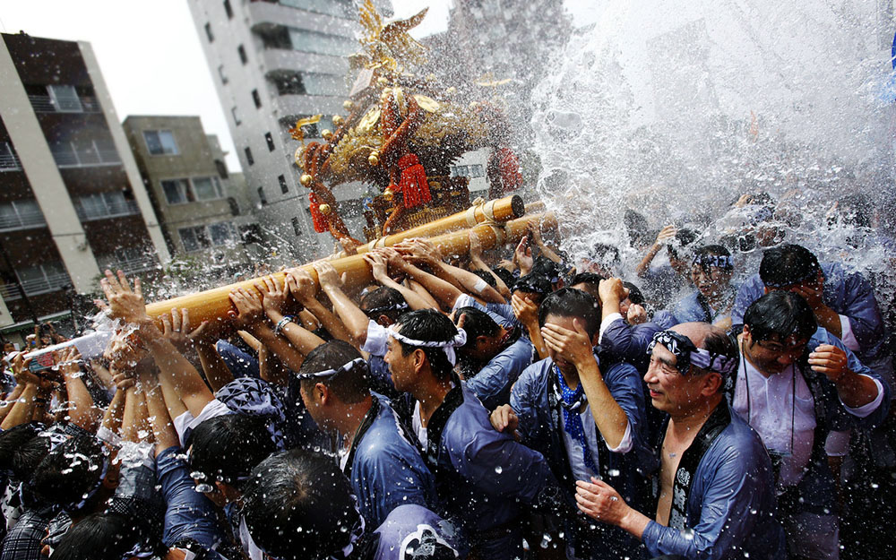 深川八幡祭是关东年度三大祭之一,于8月15日前后举办。每三年举办一次,该年则被称为“本祭”,大大小小约120座神轿都将会登场。其中50座大型神轿的联合绕境,非常震撼,只有在深川八幡祭才能看到。此祭典最著名的就是其特殊习俗,沿途围观的民众会向神轿及抬轿人泼水,表示清除秽气。图片来源:东方ic
