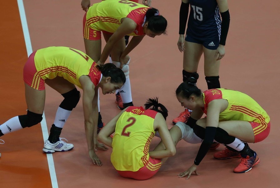 8月5日,2017年世界女排大奖赛总决赛半决赛,中国vs意大利的比赛第二局朱婷意外受伤。队友纷纷上前关心。