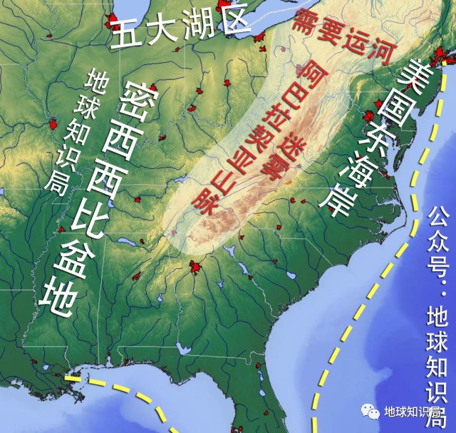 尽管穿越阿巴拉契亚山脉的山路直线距离更短,但因为山道崎岖,这条路远不如水运快捷。