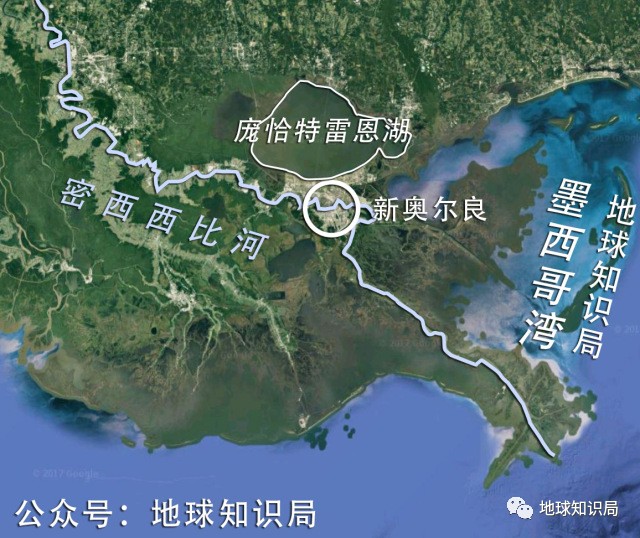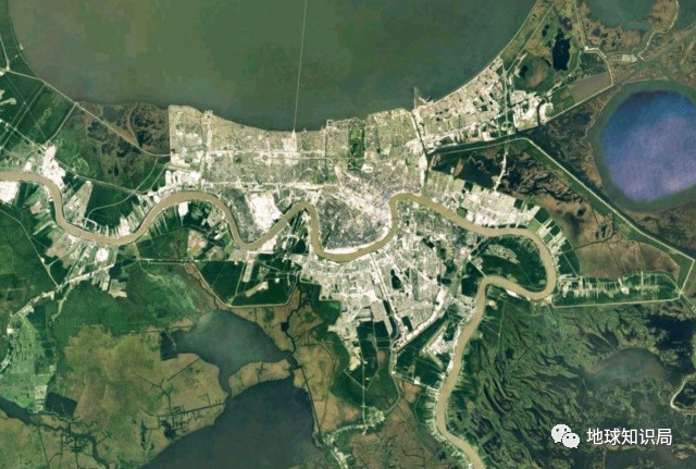 夹在密西西比河、庞恰特雷恩湖、墨西哥湾之前的新奥尔良
