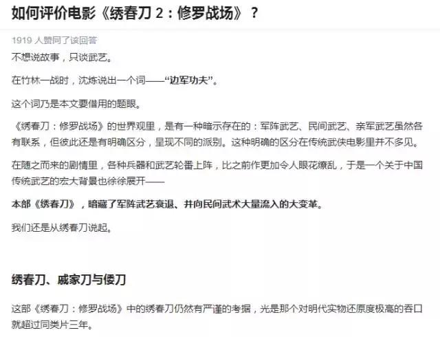 在知乎上,如何评价《绣春刀2》拥有62条回答,与其他电影的影评围绕剧本、表演、特效等不同的是,大部分回答具有强烈的影迷气质:对绣春刀、戚家刀和倭刀演变的考证,探寻民间武术融入军队操练的流变,历史谜团与政治角力的分析等。这无疑显示出,《绣春刀2》拥有相对稳定的观影群体,与武侠片成为影迷电影的现状相符合。