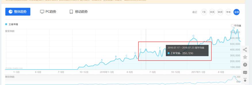 来自百度指数的数据,《王者荣耀》在发布之后开始了节节攀升的态势,但是第一个小高峰是2016年的7月份开始。