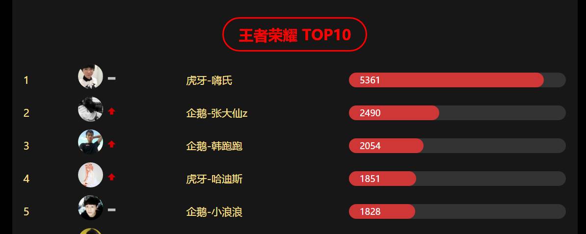 来自游久直播发布的2017年5月主播排行榜上,可以很清晰的看到在《王者荣耀》这个项目上,前5的主播,完全被虎牙以及企鹅电竞所垄断。