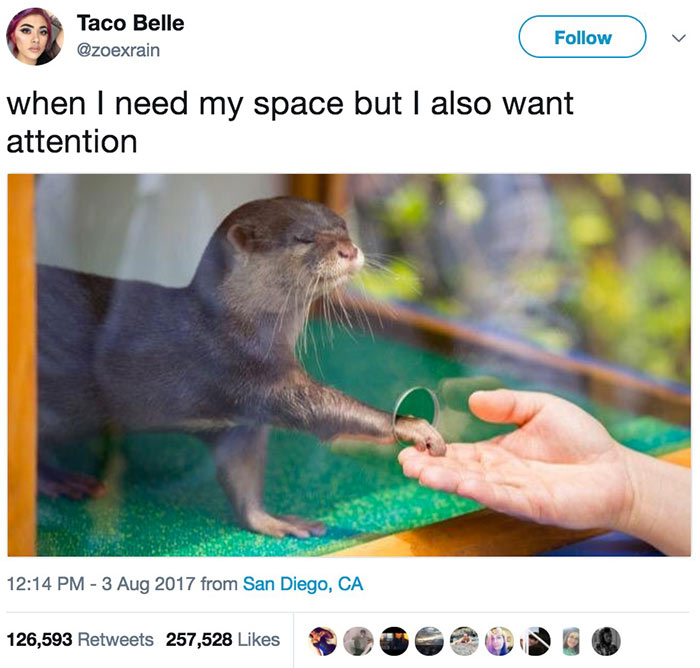社交是一件令人烦恼的事情,大多数时候我们只想一个人呆着,但是有时候也想和朋友一起玩耍。鱼与熊掌如何兼得?或许你可以学习下面这只水獭的办法。