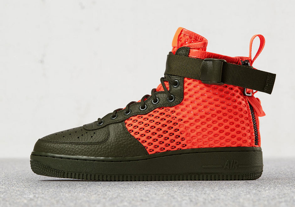 为了适应炎热的夏季,耐克改进了高帮鞋的材质。这款SF-AF1 MID采用透气的橘色网状材质打造鞋面,鞋头处军绿色皮革与亮色鞋身形成对比。后跟双拉链的设计,增加舒适感。