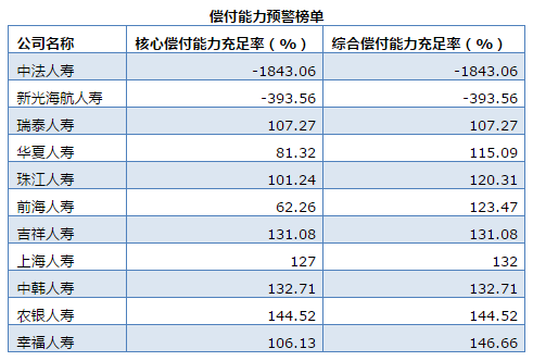 有两家公司综合及核心偿付能力均为负值,分别是中法人寿和新光海航人寿,综合及核心偿付能力充足率分别为-1843.06%、-393.56%。这两家偿付能力持续不足的公司,都是因为摊上了迟迟不增资的原始股东,换股东后增资款依然迟迟不到位。