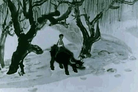 同样是水墨动画片,1963年的《牧笛》故事简单却笔触抒情,画面设计极具中国江南特色,