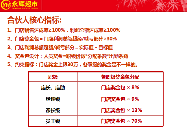 传统的雇佣模式激励体系是工资+提成+奖金+福利。增量分红模式是在传统的薪酬体系下增加利润分红。公司可以先约定目标业绩与利润,当达到目标利润后,可以把超额或者增量的利润分配给团队核心人员,存量可以按照公司90%,员工10%分配,增量部分可以是公司50%,员工50%,体现激励的效果。像永辉超市的合伙人制度,面向一线的店长、员工。实施合伙人制度效果明显,2014年永辉员工人均工资从2309元增加到2623元,增加了14%;日均人效从1610元提高到1918元,升高了19%;而离职率从6.83%降低到4.37%。