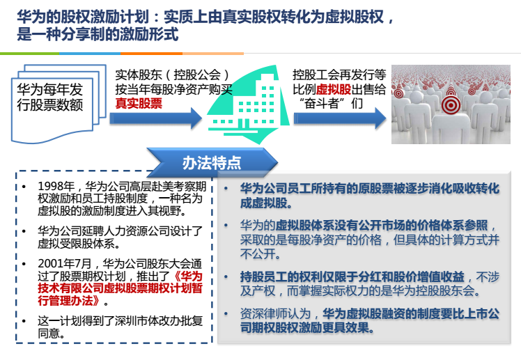 虚拟股并不是真正的公司股份,比如华为的虚拟股,本质上是一种分享制。可以将公司或者事业部资产换算成多少股,然后授予员工一定数量的虚拟股。虚拟股有分红权和资产增值收益权。这种模式对财务核算要求比较高,要特别设置好进入、调整、退出机制,特别是退出时的资产增值收益。