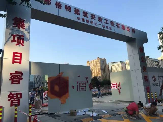 现场有几个工人正在装潢施工入口,项目围挡已焕然一新,施工入口“集项目睿智,创企业辉煌”几个大字额外醒目,横幅显示嘉悦汇如今的建筑公司已换为“成都倍特建筑安装工程有限公司”,全然一派欣欣向荣。