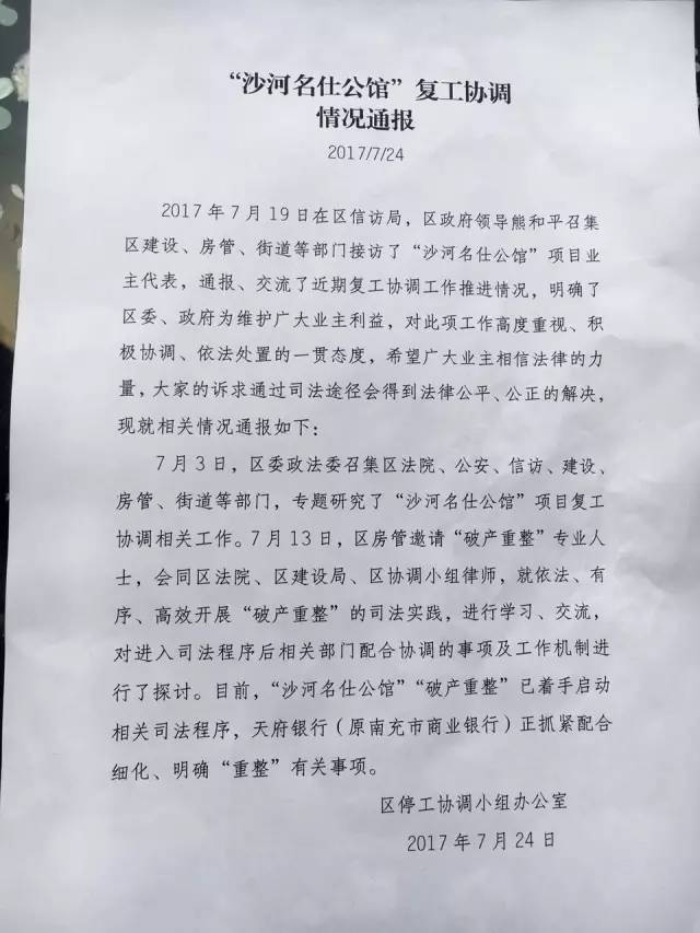 在售楼部玻璃门上,记者看到了一个由区停工协调小组办公室在2017年7月24日贴出的《“沙河名仕公馆”复工协调情况通报》,通报中讲到:“‘沙河名仕公馆’‘破产重整’已着手相关司法程序,天府银行(原南充市商业银行)正抓紧配合细化、明确‘重整’有关事项。”