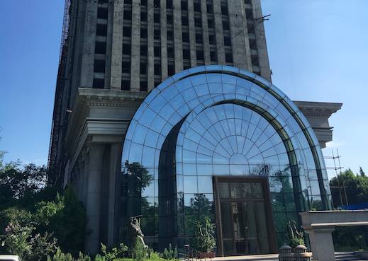 南湖国际中心位于天府新区河滨路。经过两年的风吹雨打,施工现场已破旧不堪,建筑周围的绿幕随风摇摆,很难想象两年前这里的机械也曾繁忙。通过围墙缝隙望进去,杂草丛生,地面上摆放的钢铁已经锈迹斑斑,墙砖四处堆积,还有破旧的拉土车,像极了了无人迹的荒野。