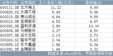 今日周期股大有“卷土重来”之势。北方稀土(600111.SH)获主力11.22亿元抢筹稳居两市个股净流入第一。太钢不锈(000825.SZ)、宝钢股份(600019.SH)、马钢股份(600808.SH)三只钢铁股获主力资金追捧,分别实现5.49亿元、4.52亿元、2.27亿元的主力净流入。此外,北方稀土、盛和资源涨停。