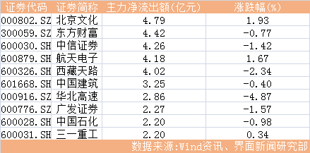 北京文化(000802.SZ)、东方财富(300059.SZ)、中信证券(600030.SH)三只个股主力净流出额位居前三位,分别为4..79亿元、4.42亿元、4.26亿元。近日《战狼2》票房大捷,北京文化作为相关概念股之一,股价也随之暴涨,不过今日却遭遇主力“无情”抛售,净流出额位居两市个股第一。
