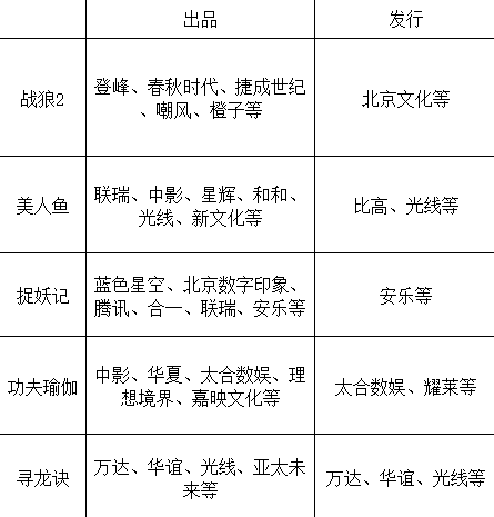 《战狼2》和《寻龙诀》的出品公司(不包括联合出品)都比较少,而《美人鱼》、《捉妖记》、《功夫瑜伽》的出品公司(不包括联合出品)都远超表格中所体现的数量。