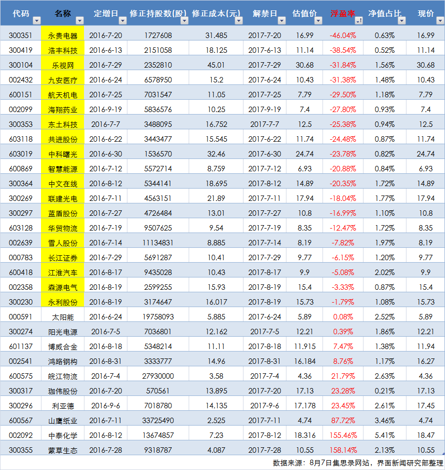 从浮亏程度来看,11只个股浮亏超两成,浮亏最严重的永贵电器(300351)已于7月20日解禁,按照目前的市价来计算,浮亏46%。