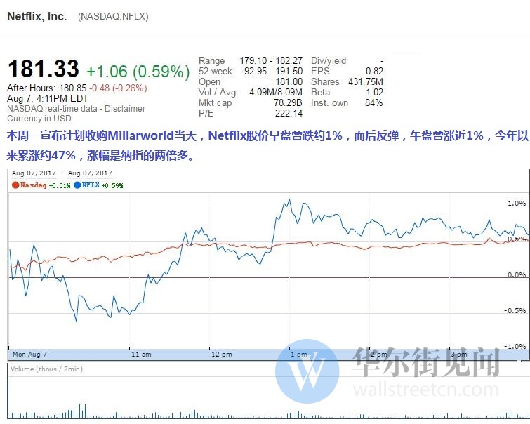 周一公布计划收购当天,Netflix股价高开,早盘曾跌破180美元,跌超1%,但此后反弹,午盘升破182美元,涨近1%,最终收涨0.59%。今年以来Netflix股价累涨约47%,涨幅是纳指的两倍多。