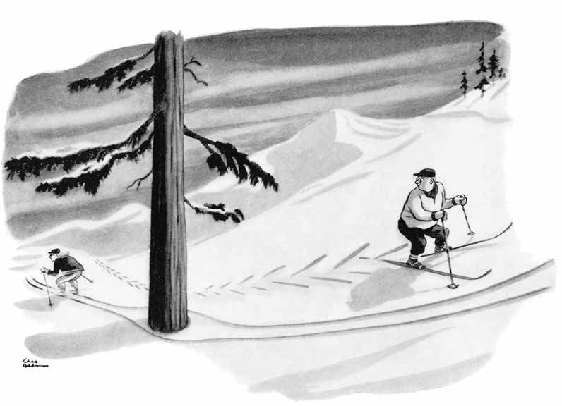 1940年,《纽约客》历史上最著名的漫画之一出现了:查尔斯 · 亚当斯的无题漫画。作品中的滑雪者正朝下坡俯冲,雪橇板在雪中留下的痕迹显示,这位滑雪者既没有直接穿过身后的那棵树,也没有从旁边绕过它。