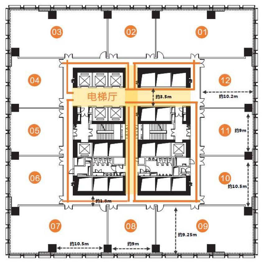 下面这张图是华润前海大厦的一个标准层,你发现它有什么特点了吗?十字核心筒设计,有多达四面企业形象展示墙。承重柱紧贴幕墙,创造出几乎无柱的室内空间。也就是说,整个室内接近空无一物,客户想怎么布置就怎么布置,平面使用效率和灵活性非常之高。