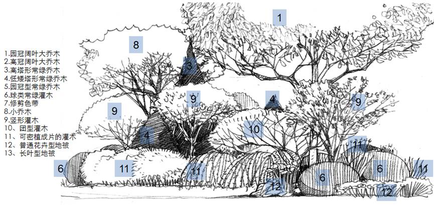 这其中最关键的点在于,要选取适合北方气候的植物,为了有足够又合适的树种。比如,龙湖在北京等地都专门建设了苗木基地。下图是龙湖某项目五重景观的示意图。