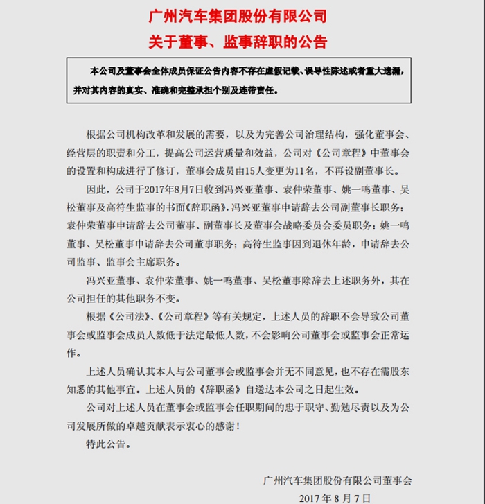 广汽集团官网发布公告称,公司于2017年8月7日收到冯兴亚、袁仲荣、姚一鸣、吴松及高符生的辞职信。公告写道:冯兴亚申请辞去副董事长职务;袁仲荣申请辞去执行董事、副董事长及董事会战略委员会委员职务;吴松申请辞去执行董事职务;姚一鸣申请辞去非执行董事职务;高符生则因到了退休年龄,申请辞去监事及监事主席职务。