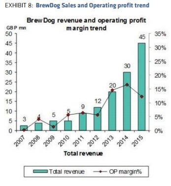 上图:2007至2015年,BrewDog 销售收入(绿色柱状条)和经营利润率(曲线)变化情况