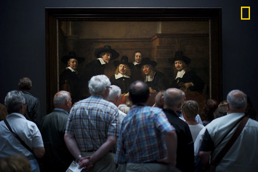 荷兰丨阿姆斯特丹的国家博物馆里,一群观众在端详伦勃朗的画作《布商行会的理事们》(Syndics of the Drapers’ Guild),画中的人们似乎也在好奇地看着画作前的围观者,面面相觑,场面十分有趣滑稽。(摄影师:Julius Y.)