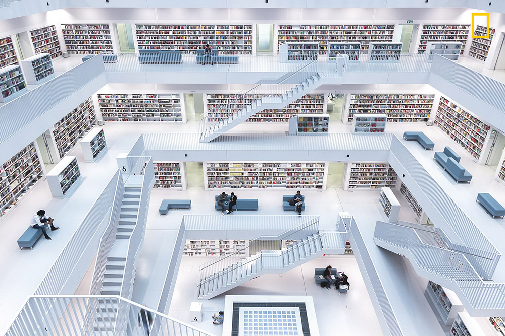 德国丨位于德国西南部的斯图加特图书馆,洁净纯白的地板、窗明几净的大窗户、宽阔整齐的四面书墙,营造出舒适开放的空间,中庭再洒下明媚自然的阳光,尽显极净之美。(摄影师:Norbert Fritz)