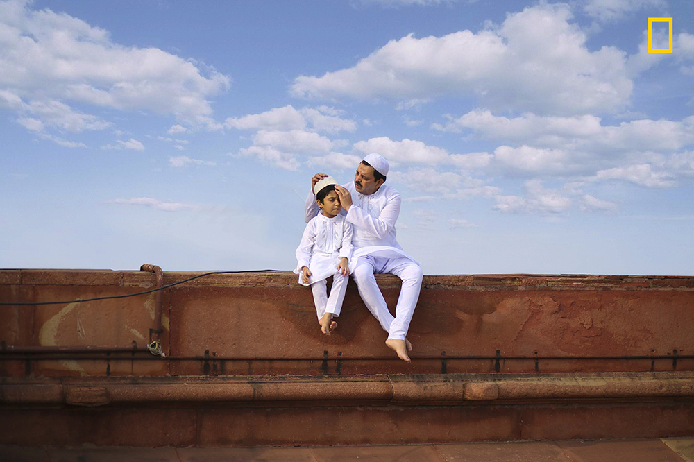 印度丨在新德里的一个清真寺里,一位穿着传统白色衣服的父亲正在细心地帮儿子整理帽子,两个人都光着脚丫子,显得舒适自在,父与子的画面格外的温馨和美好。(摄影师:Jobit George)
