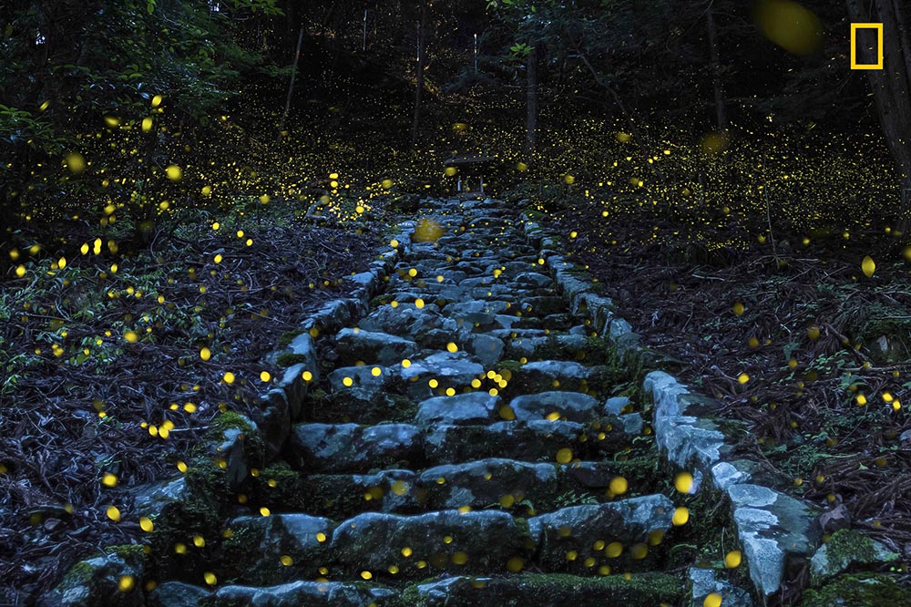 日本丨在坦巴地区一个偏远的小村庄里,闪烁的萤火虫照亮了盛夏的森林,像一张幽幽发亮的神奇地毯铺向受当地人民朝拜的小神社。(摄影师:Y. Takafuji)