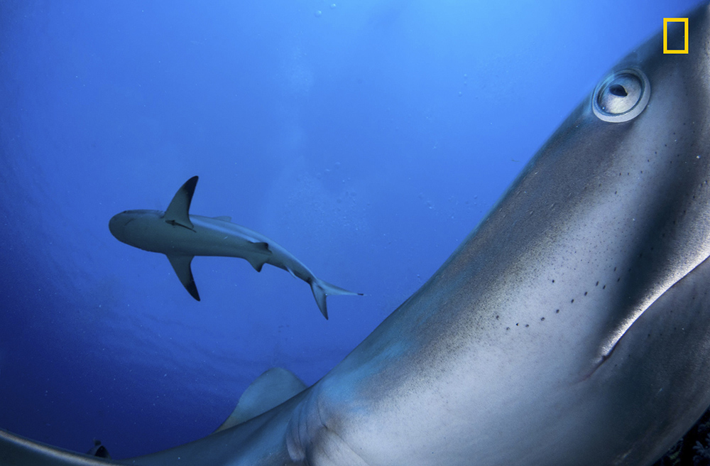 古巴丨在古巴以南偏远的海域,这些加勒比海礁鲨的存在显现出生态系统的完整性,为了不惊吓它们,摄影师把相机放在鲨鱼经常出没的一块岩石上,不料鲨鱼还是迷迷糊糊地撞在了相机上。(摄影师:Shane Gross)