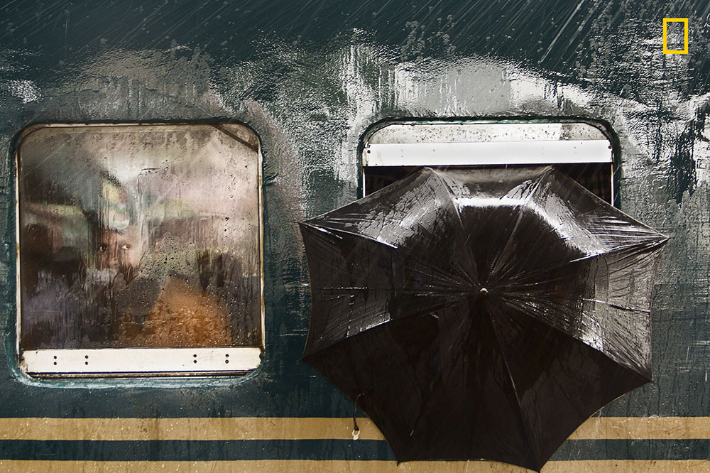孟加拉国丨在一节停靠在加齐卜尔火车站的火车车厢里,车窗内有一双好奇的眼睛注视着镜头,旁边旅客还伸出一把被雨水打湿的黑色雨伞,组成了一个奇异怪诞的瞬间。(摄影师:Moin Ahmed)
