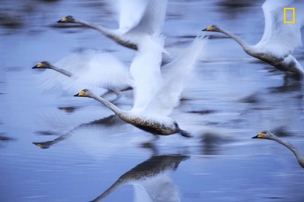 日本丨在大崎市珍贵罕见的天然湿地里,摄影师Hiromi Kano捕捉到一群天鹅正在滑行起飞的瞬间,画面展现出扑翼的力量和优雅,这片湿地不只是他们舒适的越冬地,也许还即将成为它们最后留守的天堂。(摄影师:Hiromi Kano)