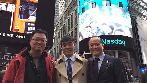 紫辉创投是锤子科技的A轮投资方,郑刚作为紫辉创投CEO以大胆、敢说话著称。在担任中宇卫浴CFO时,郑刚曾带领企业上市,创下中资在欧洲资本市场最大融资额纪录。2011年郑刚创办了上海紫辉创业投资有限公司,陌陌、触宝科技、锤子都是其明星投资项目。并与罗永浩、唐岩关系很好。下图为陌陌上市时,三人在纽交所前面的合影: