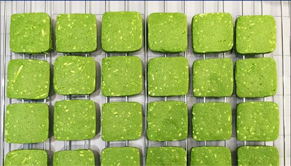 抹茶粉8g、杏仁粉30g 、杏仁碎随意、蛋黄1个 、低粉100g 、糖粉40g 、黄油70g(此配方大约可做28块饼干)