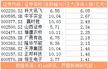 科大讯飞(002230.SZ)、中孚实业(600595.SH)、赢时胜(300377.SZ)占据个股主力净流入前三,分别实现净流入6.05亿元、2.67亿元、2.49亿元。中孚实业延续周期股行情,早盘后便封板涨停,盘中三度被砸,最终仍是涨停。创业板领涨个股赢时胜亦以涨停报收。值得注意的是,农林牧渔板块个股表现抢眼,雏鹰农牧(002477.SZ)、正邦科技(002157.SZ)分别吸引主力资金2.25亿元、1.46亿元。