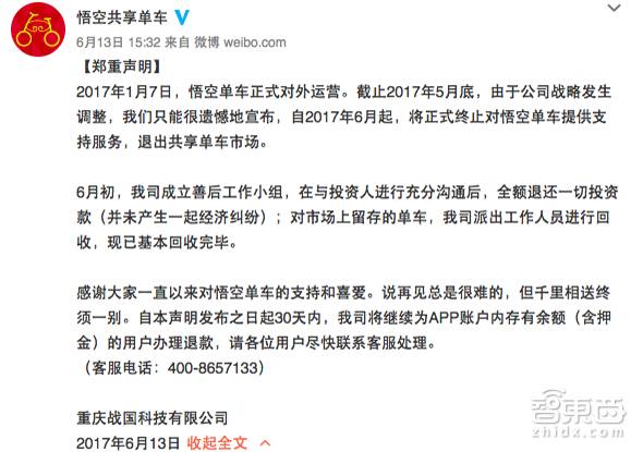 6月13日,悟空单车在微博上正式发出公告,宣布自6月起停止服务,退出共享单车市场。在此前数天,创始人雷厚义和团队成员中止项目的行为无声而悲壮——将找回的近500辆共享单车悉数送人。