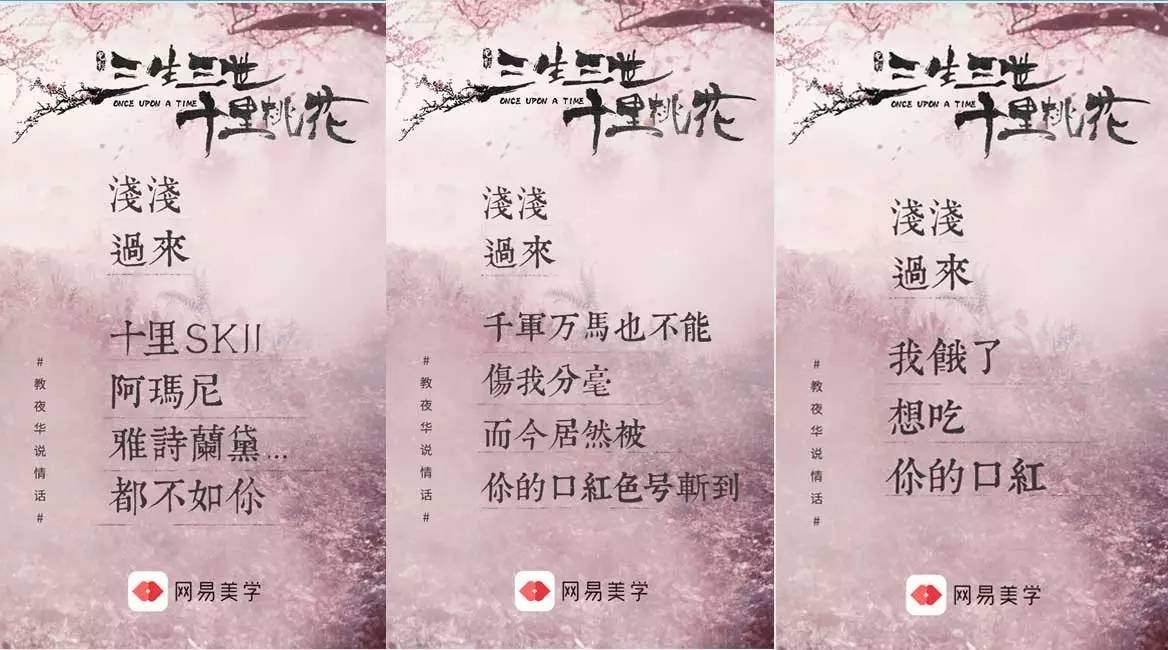 网易美学是网易于去年年底成立的首个垂直美妆社区,专注用户快速学习变美知识、发现和分享个性化美妆、护肤、美体内容。用户以年轻女性为主。那么,短时间内迅速曝光和打响品牌,自然成为了网易美学现阶段的主要市场任务。在这样的背景下,美学将目光瞄准《三生三世十里桃花》这个社会热点,针对社区里的小仙女和市场目标用户设计了一系列少女心十足却又颇具魔性洗脑意味的营销活动。