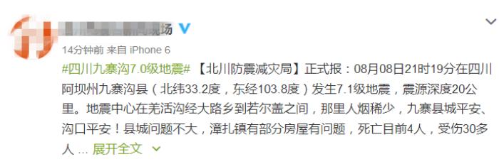 此前,网络上传播了一条来自“北川防震减灾局”的消息,称地震致4人死亡30多人受伤。人民日报记者联系到北川防震减灾局,该局辟谣表示,并未发布此消息。不信谣,不传谣,为震区人民祈福!