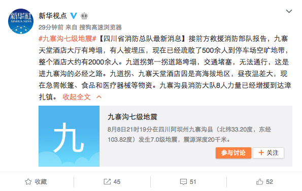 据四川省消防总队最新消息:接前方救援消防部队报告,九寨天堂酒店大厅有垮塌,有人被埋压,现在已经疏散了500余人到停车场空旷地带,整个酒店大约有2000余人。九倒拐第一拐道路垮塌,交通堵塞,无法通行,这是进九寨沟的必经之路。九倒拐、九寨天堂酒店因是高海拔地区,昼夜温差大,现在急需帐篷、食品和医疗器械等物资。九寨沟县消防大队8人力量已经增援到达漳扎镇。2017年8月9日凌晨,四川消防发布消息称,目前,滞留2800余人全部安全疏散。