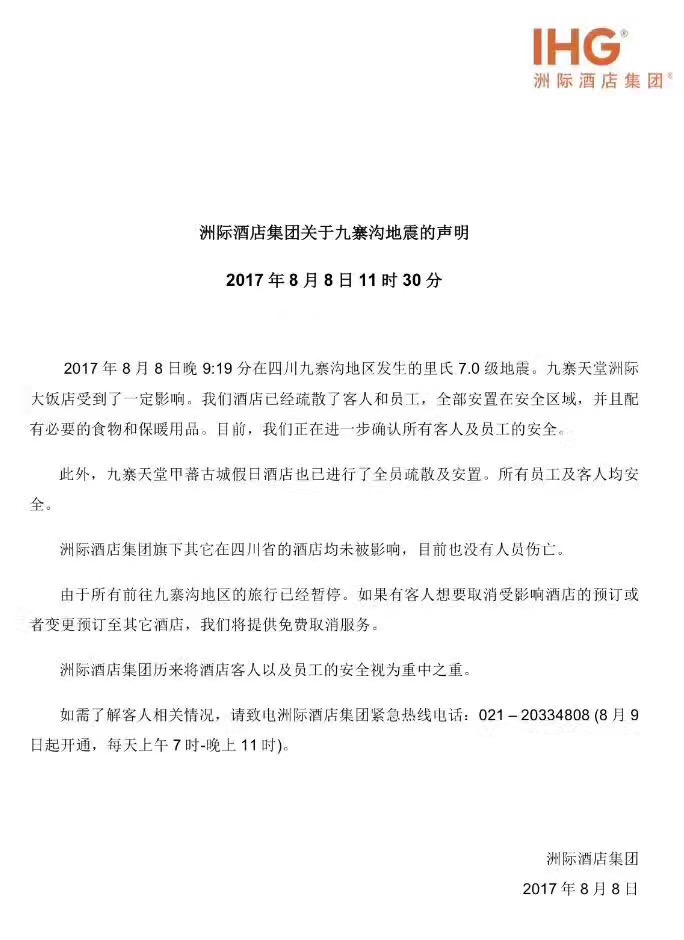 另据洲际酒店集团11时30分在官方微博上发布的声明称,该酒店受到了地震的影响,目前已经疏散了客人和员工,安置在了安全区域,并且配有必要的食物和保暖用品,目前正在进一步确认所有客人及员工的安全。此外,九寨天堂甲蕃古城假日酒店也已进行了全员疏散和安置,所有员工及客人均安全。该集团旗下其它在四川省的酒店均未被影响,目前没有人员伤亡。
