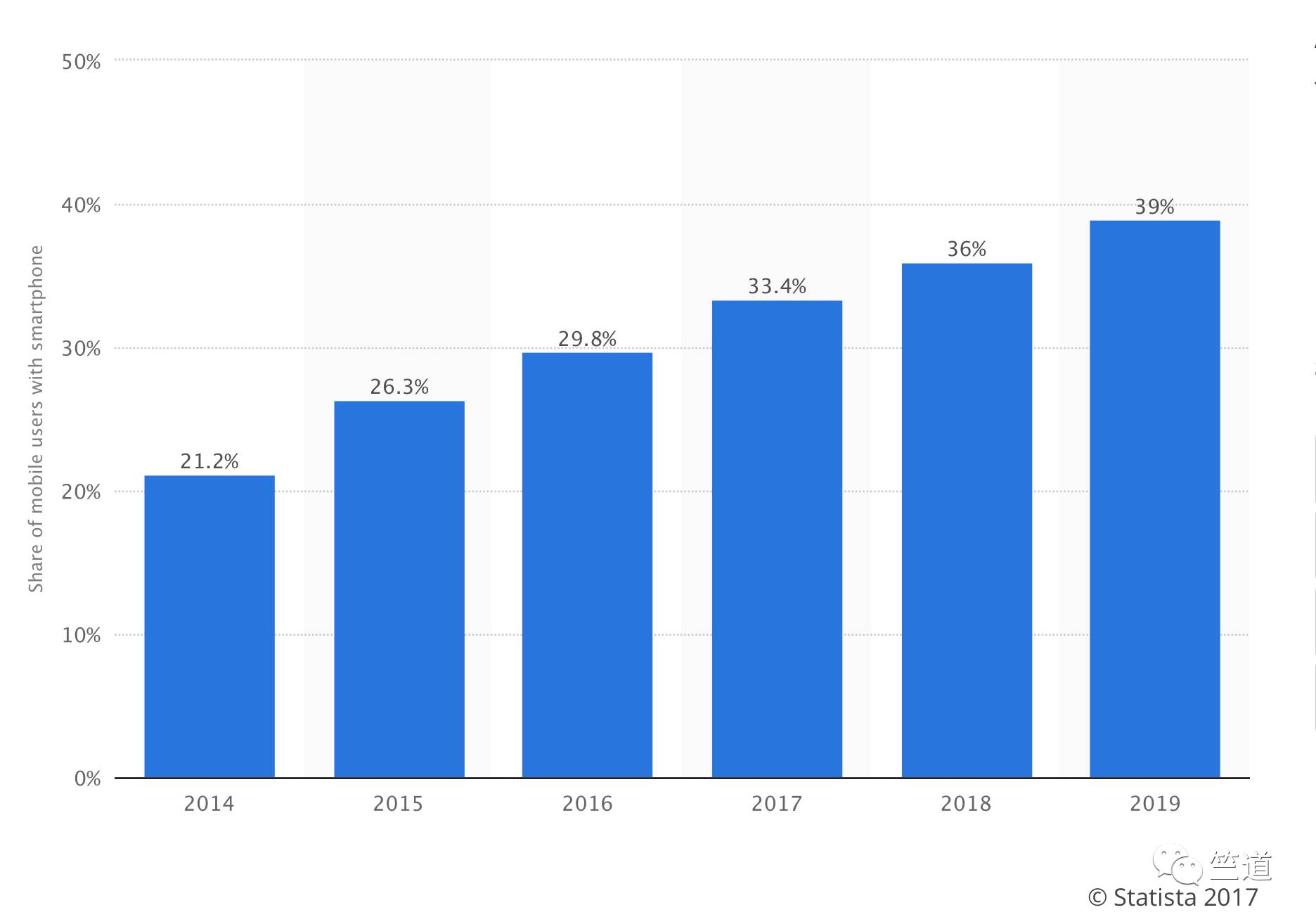 根据互联网市场数据研究机构Statista给出的数据和预测,今年印度市场智能手机的占比会达到33.4%,预计2018年的占比会达到36%,2019年的占比达到39%。