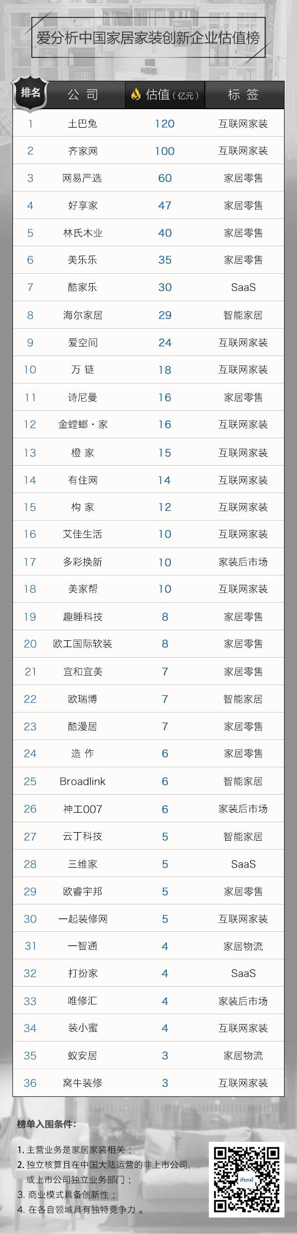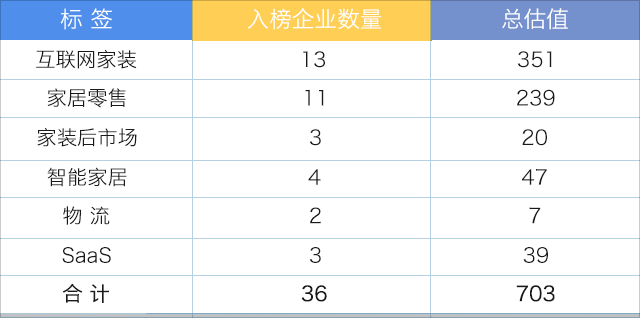 本次榜单涵盖了互联网家装、家居零售、家装后市场等细分领域,共计36家上榜企业,总估值700多亿元。上榜企业需满足以下条件:1)主营业务是家居家装相关;2)独立核算且在中国大陆运营的非上市公司,或上市公司独立业务部门;3)商业模式具备创新性;4)在各自领域具有独特竞争力。