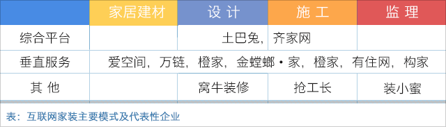 互联网家装可以分为综合平台模式、垂直服务模式,以及装小蜜、窝牛装修等从设计、工长和第三方监理等单个环节切入的模式。从参与者来看,包括了上游房地产和家居建材商、互联网和实业巨头以及老牌公装和家装企业。