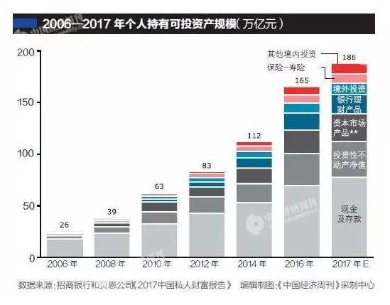 招行和贝恩的报告预计,2017年高净值人群持有财富总量将达58万亿元,同比增长19%,人均拥有3670万元可投资资产。中国私人财富市场总体处于快速增长阶段,具有巨大增长潜力和空间。