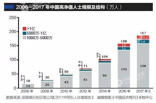根据招行和贝恩的报告,高净值人士的数量从2006年的18万人增长到2016年的158万人,相当于过去11年间,每天有接近400张“新面孔”跻身高净值人士行列。